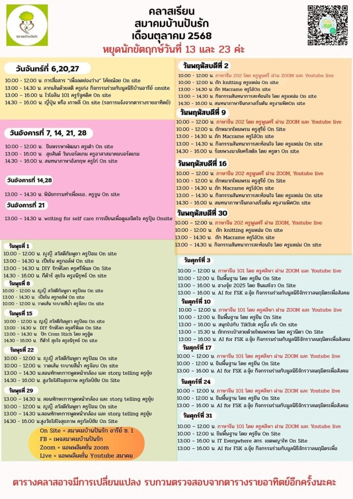 ในวันพฤหัสบดี สัปดาห์ที่ 3 ของเดือน (คลาสมี 1 ครั้ง ต่อเดือน) เวลา 14.30-16.00 น. On site ณ สมาคมบ้านปันรัก